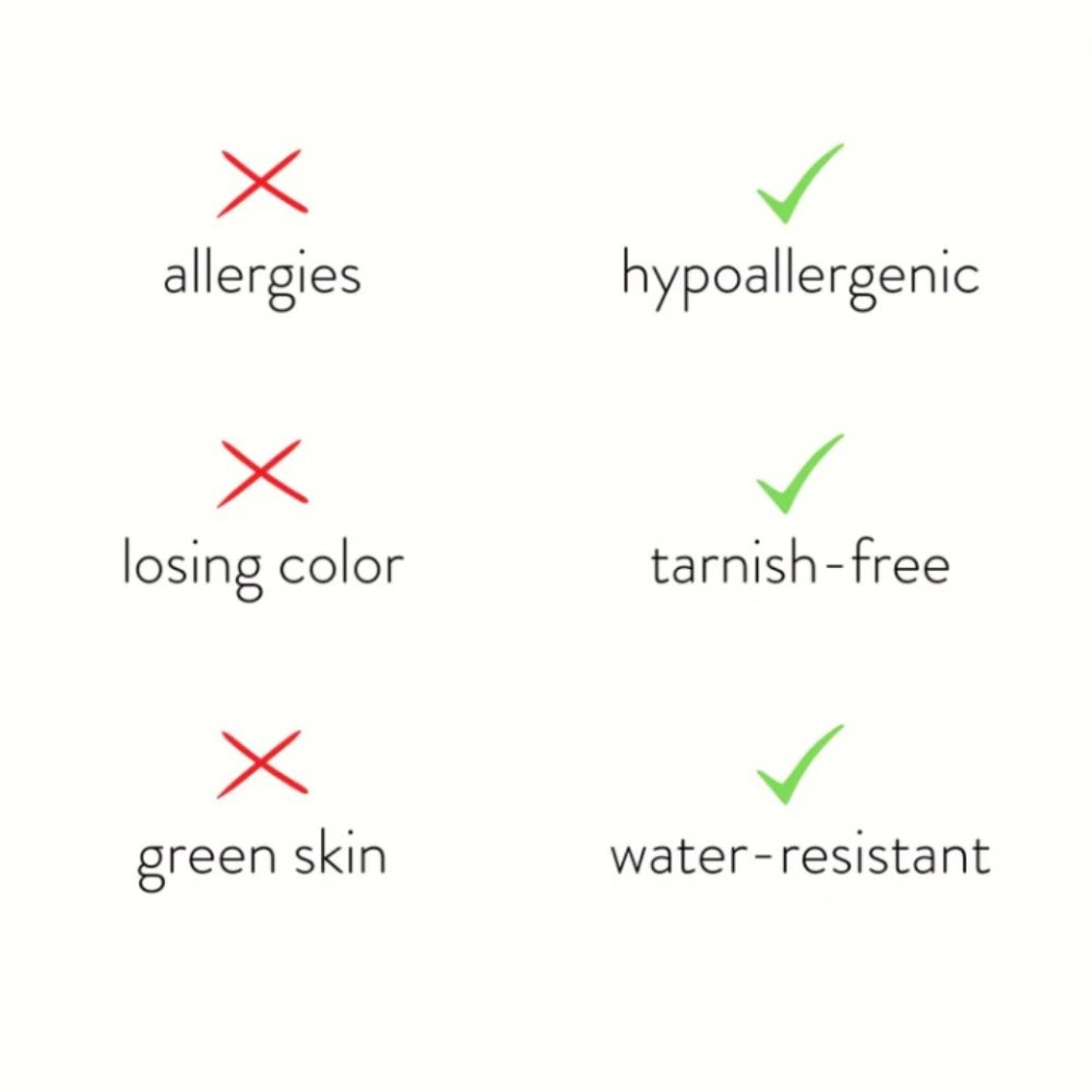 Discover our stunning jewelry, crafted from tarnish-free stainless steel. Enjoy the peace of mind that comes with hypoallergenic, lead & nickel-free materials, ensuring comfort and durability without the worry of green fingers or fading.